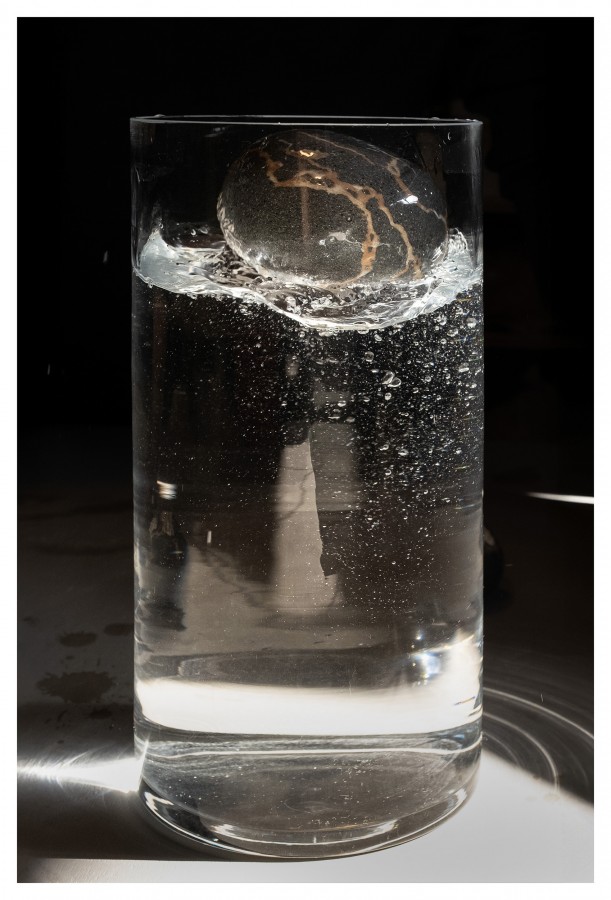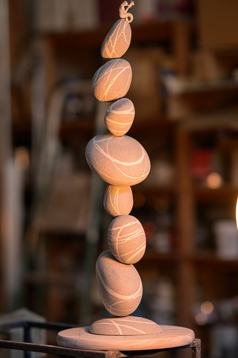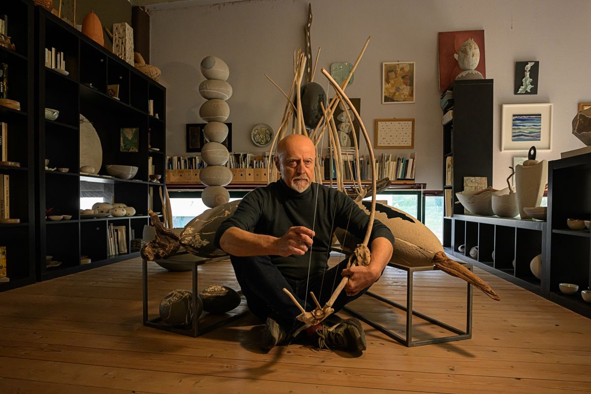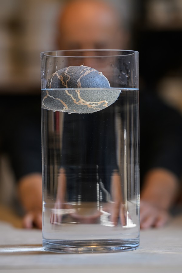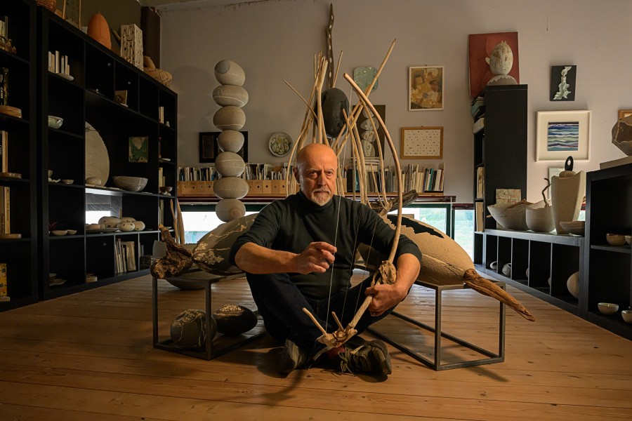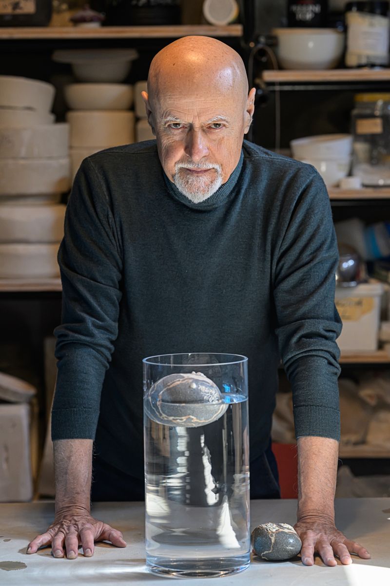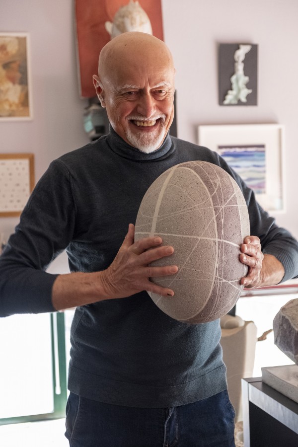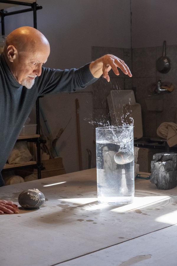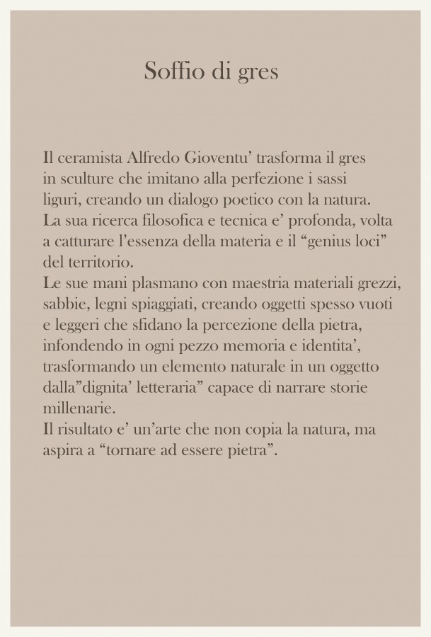 Illustrazione da parte di Alfredo Gioventu del rapporto tra la sua arte e la natura, in particolare i caratteristici sassi della spiaggia di Renà, che hanno ispirato l'artista nella realizzazione dei famosi "sassi galleggianti"